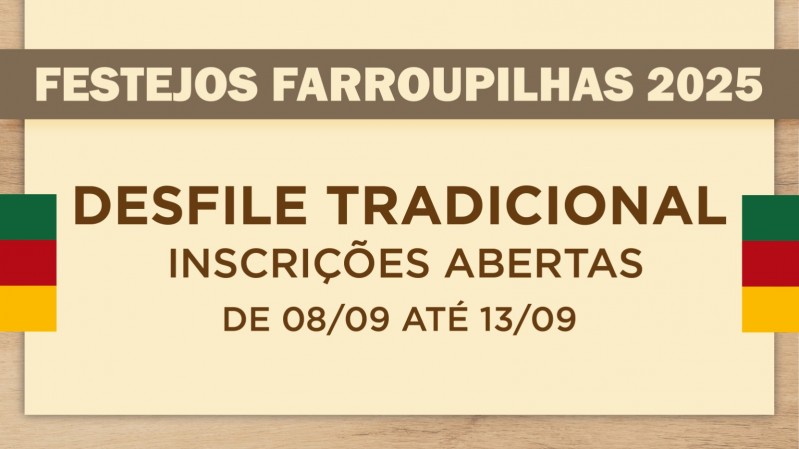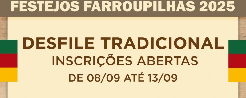 As inscrições para o Desfile Tradicional de 20 de setembro em Porto Alegre estarão abertas a partir desta segunda-feira (8/9) e podem ser realizadas até o dia 13 de setembro, das 11h às 18h. Os interessados devem comparecer ao Espaço do Governo do Estado – Piquete O Sul Tchê Espera, no Parque Maurício Sirotsky Sobrinho (Harmonia), em Porto Alegre. A atividade é promovida pela Comissão Estadual dos Festejos Farroupilhas.