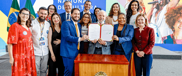 Em cerimônia nessa segunda-feira (17) no Palácio do Planalto, em Brasília (DF), a ministra da Cultura, Margareth Menezes, e o presidente Luiz InácioLula da Silva enviaram ao Congresso Nacional o texto do novo Plano Nacional de Cultura (PNC), documento que irá orientar a formulação e a execução das políticas culturais no Brasil pelos próximos dez anos. Durante o ato também foi assinado o decreto que institui a Comissão Intergestores Tripartite (CIT), fundamental para a pactuação federativa na implementação de políticas públicas de cultura. Os Agentes Territoriais de Cultura, que integram o Programa Nacional dos Comitês de Cultura (PNCC) e acompanharam o evento, souberam em primeira mão sobre a prorrogação da iniciativa do Ministério da Cultura (MinC). “Hoje é um dia especial, porque é a realização de um sonho que eu tenho há muito tempo, de transformar a cultura em um movimento efetivamente de base, uma coisa popular, onde as pessoas precisam ter a liberdade de fazer e provocar que os outros façam acontecer a cultura nesse país”, afirmou o presidente Lula.
