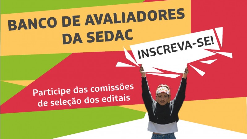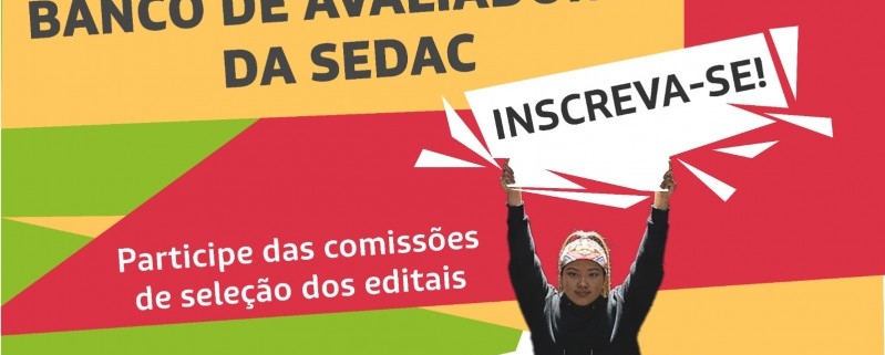 A chamada pública que a Secretaria da Cultura (Sedac) está realizando para credenciar pessoas físicas a fim de compor o Banco de Avaliadores da pasta segue recebendo inscrições por meio deste formulário. Os credenciados poderão integrar as comissões de seleção de editais da secretaria – o próximo certame, que deve ser lançado em fevereiro, vai selecionar artistas para atuação em escolas de tempo integral (mais informações abaixo).