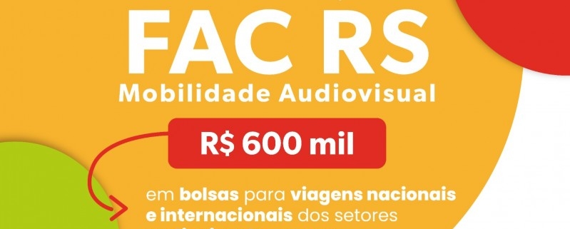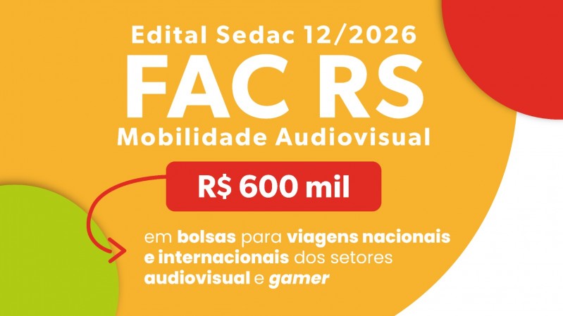 A Secretaria da Cultura (Sedac) lançou o Edital Sedac 12/2026 – FAC RS Mobilidade Audiovisual, publicado no Diário Oficial do Estado de terça-feira (31/3). Com investimento total de R$ 600 mil, o certame vai apoiar a participação de empresas dos setores audiovisual e de jogo eletrônico (gamer) do Rio Grande do Sul em eventos ou atividades realizadas em outros estados e países, em 2026 e em 2027. As inscrições estão abertas até as 16h59 de 8 de maio, pela página do Pró-Cultura, onde a íntegra do edital está disponível.