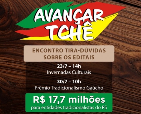 A Secretaria da Cultura (Sedac), por meio da Coordenadoria do Tradicionalismo Gaúcho, realizará dois encontros virtuais para apresentar os editais que integram o programa Avançar Tchê. As reuniões acontecem nesta quarta-feira (23), às…